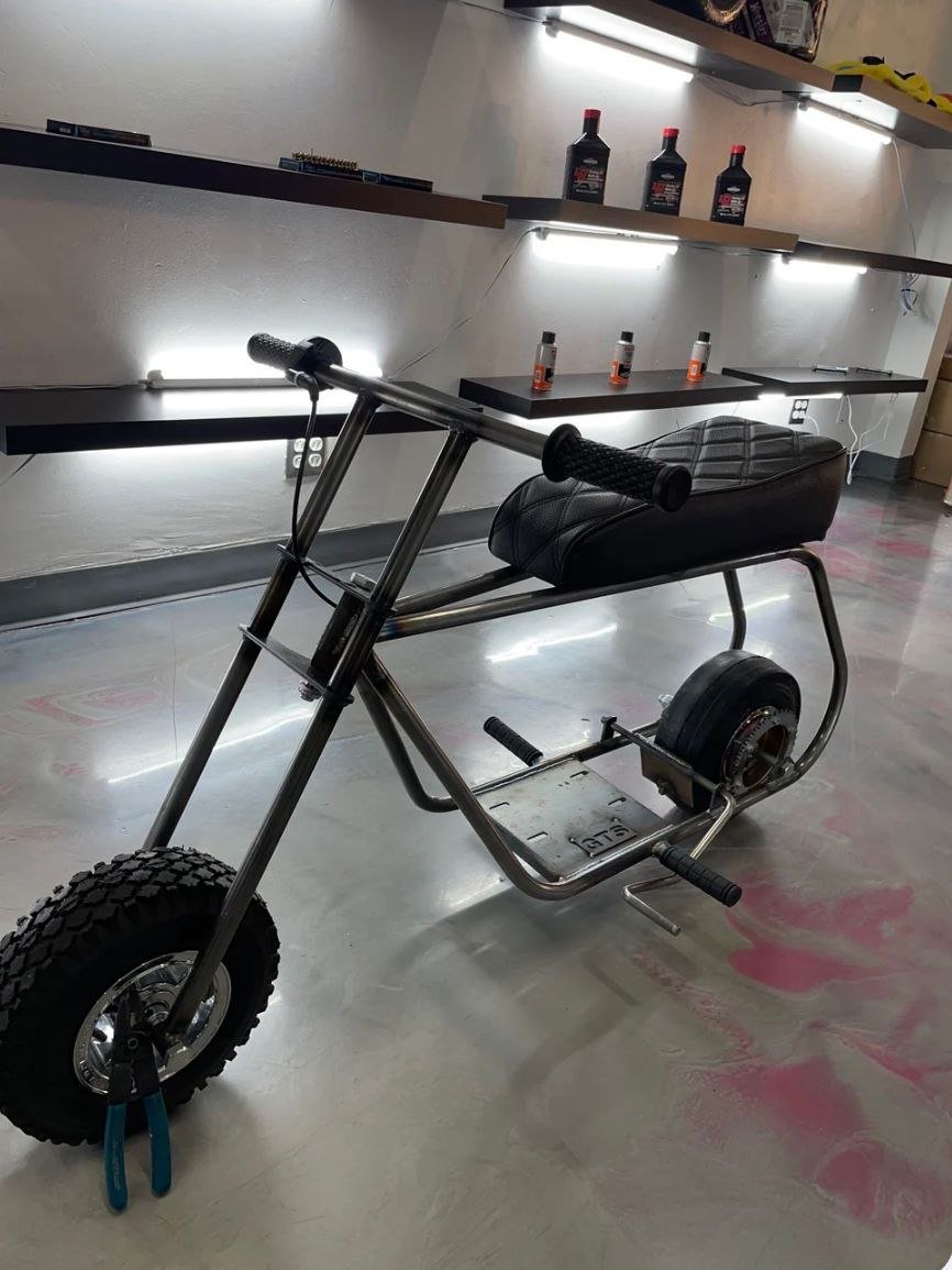 Featuring Volts T-Bars mounted on a durable GTS frame, this minibike roller offers a clean foundation for your custom build. Included in the setup are a precision throttle system, a diamond-stitched Volts seat for added comfort and style, front and rear wheel assemblies, wheel axles, and lock collars. Designed for performance and reliability, this roller provides everything you need to get started—just add your engine and personal touches.