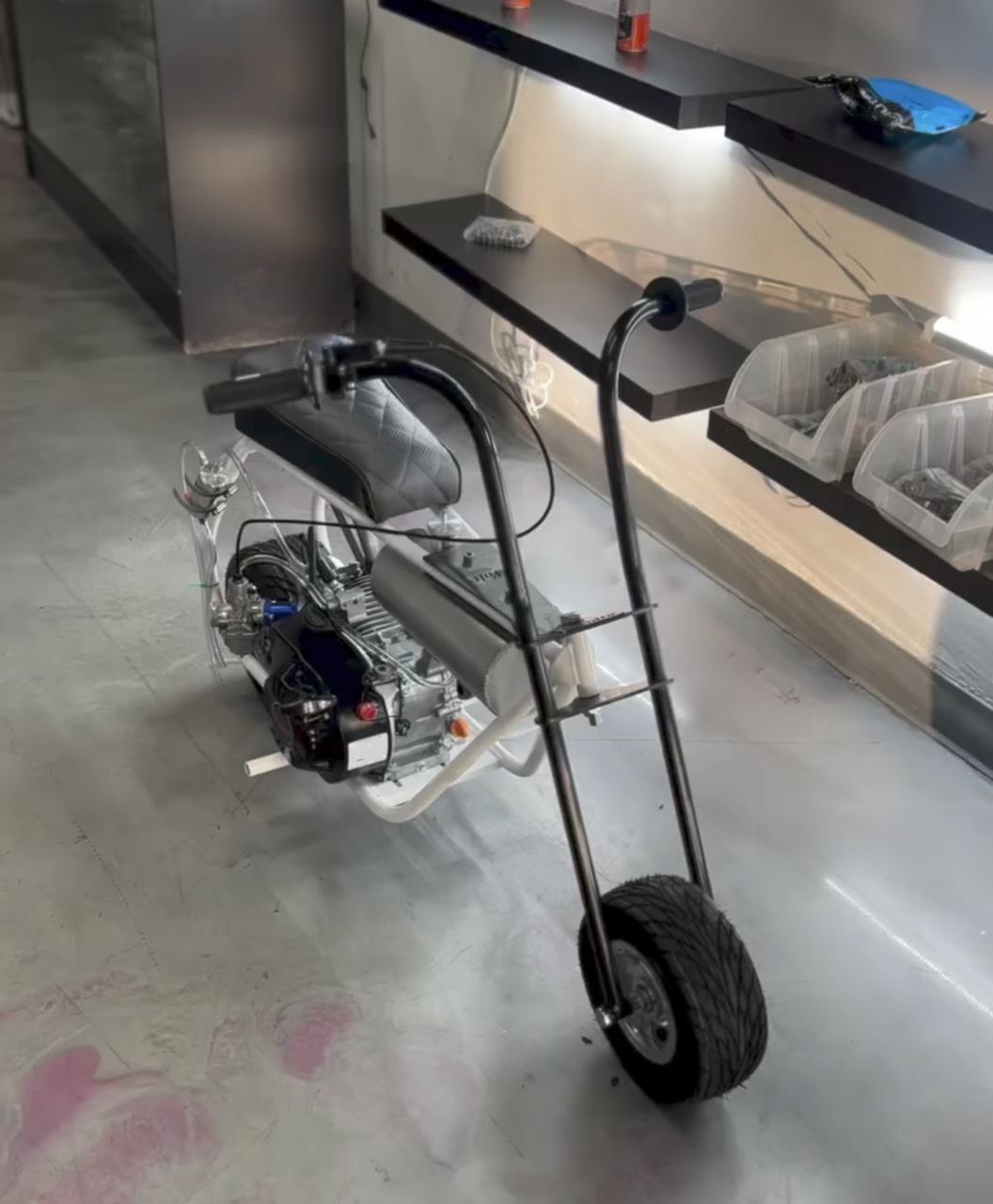 Engineered for riders who crave performance and style, this exclusive custom minibike delivers an unbeatable combination of craftsmanship, durability, and speed. Finished in a premium white powder-coated frame with a sleek black diamond-stitched seat, itβs built to turn heads while dominating the streets.